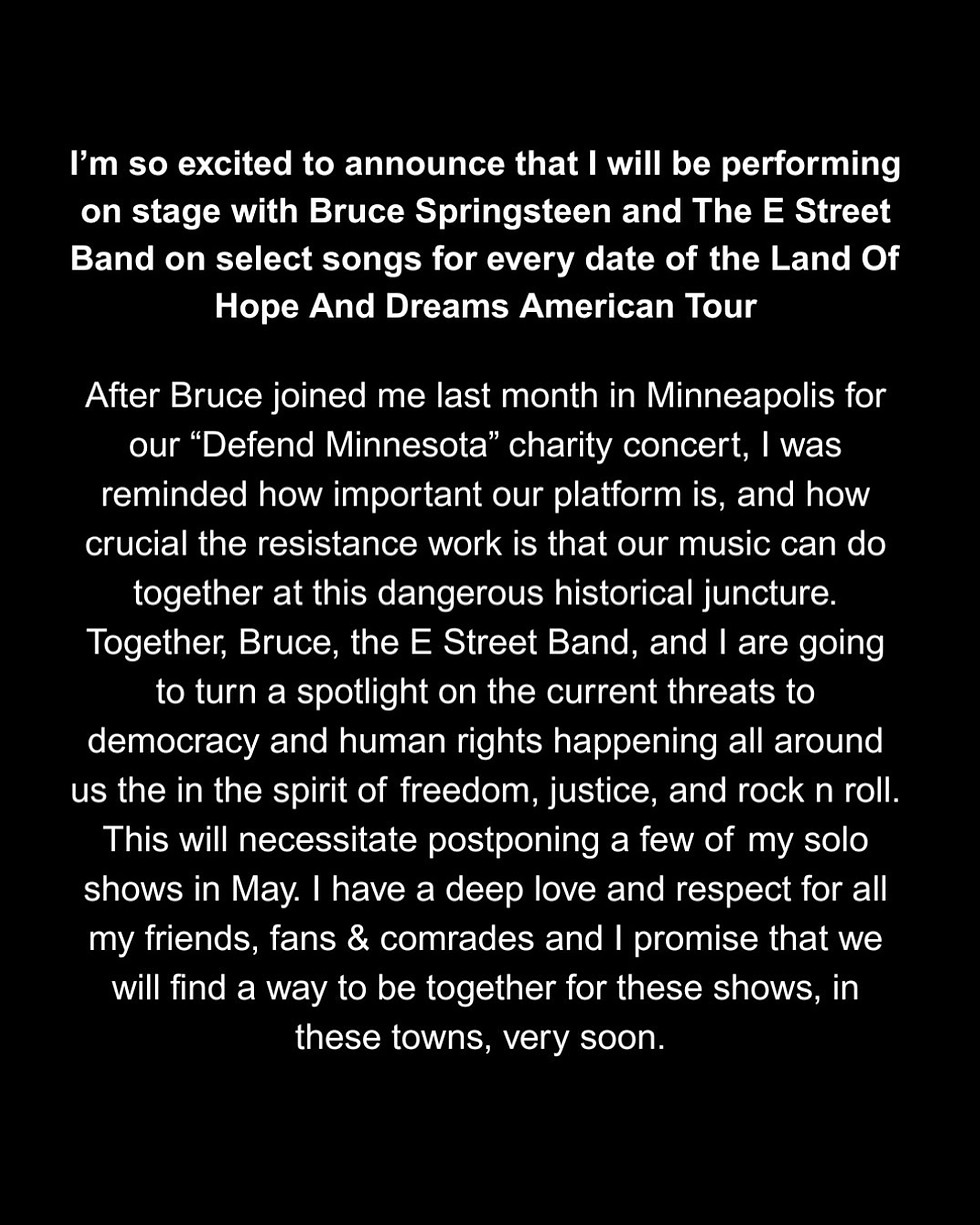 Depois que Bruce se juntou a mim no mês passado, em Minneapolis, para o nosso show beneficente “Defend Minnesota”, fui lembrado do quanto nossa plataforma é importante e de como é crucial o trabalho de resistência que nossa música pode fazer neste momento histórico perigoso.